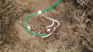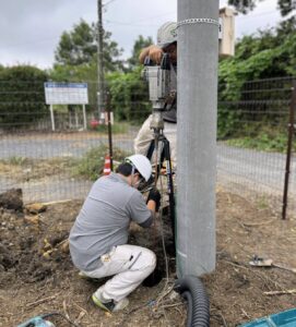 実際の施工も地面に電気が流れやすい銅の棒を定められた規定値が出るまで「ひたすら何本も」打ち込んで行き、規定値がでた銅棒と対象設備・機器とを、被覆が巻かれている動線で繋ぎます。